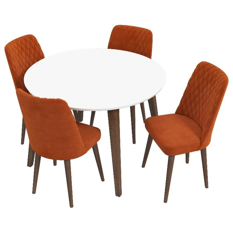 Mid-century modern furniture style Round solid wood dining table and comfortable dining chairs an easy addition to any dining room set. This modern small kitchen dining set: breakfast table constructed from durable easy clean wood; comfortably used as dini