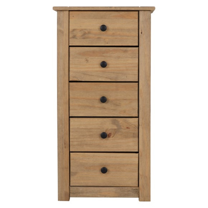 The tall Panama 5 Drawer Chest boasts a light natural aax finish and black metal hinges and handles which contrast each other beautifully. The five drawers offer plenty of storage space and will add rustic style to your home.Installation Note: This product