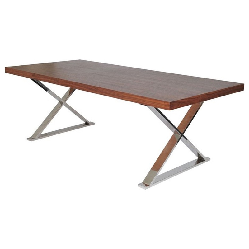 Ultra modern and chic dining table with high polished X-shaped steel legs. This piece will make a big statement in your dining room. Sits up to 8 people. Distance between legs is 60". Basic Assembly required. Features: -Material: Wood veneer, high polished