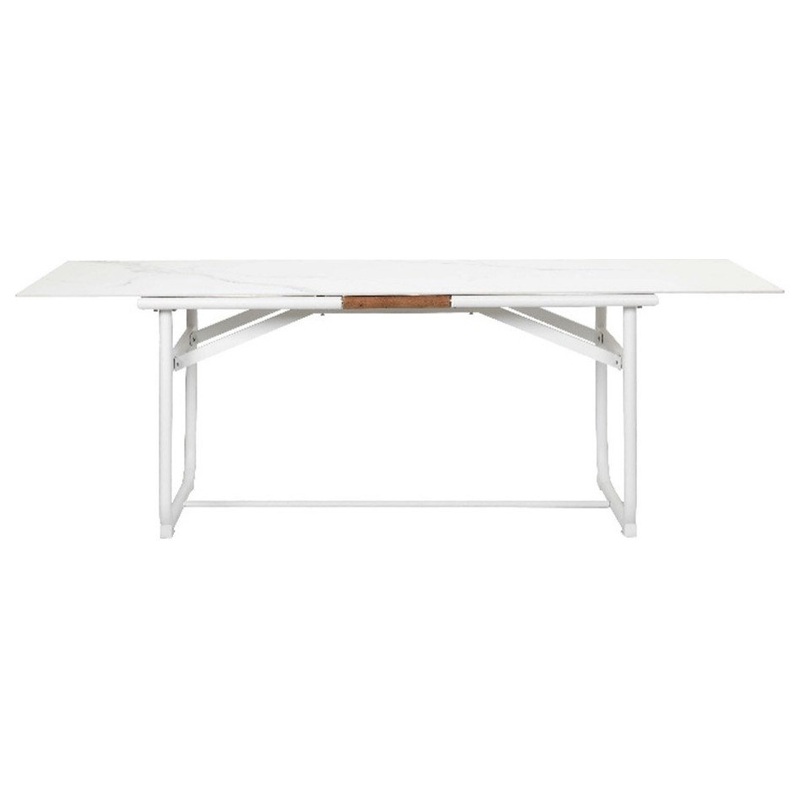Beautiful modern dining table that is made from an aluminum frame ceramic top and finished in white. Also, it will be more wonderful with modern style. Features: -Materials: Aluminum -Finish: White -Fade resistant Specifications: -Product Dimensions: 30"H