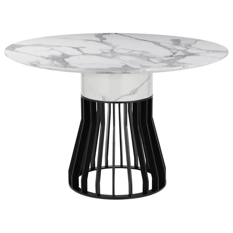 Clean and edgy modern 47" round table with caged tapered metal base and round faux marble top; sits 4-5 comfortably. Also great to use as an entry table. Features: -Material: Faux marble, metal -Finish: Black, white -Style: Glam, modern -Sits 4-5 comfortab