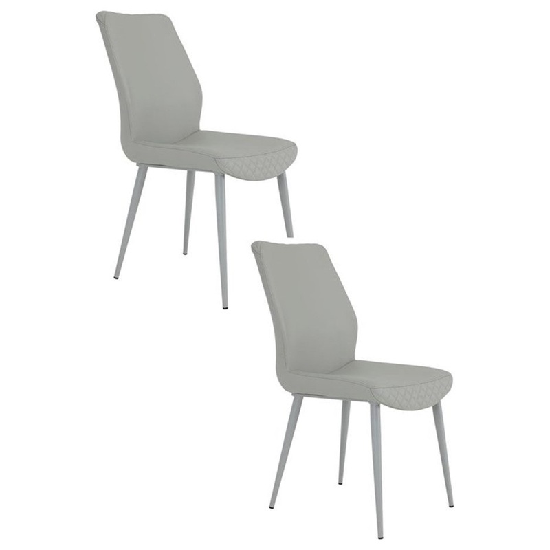 Set of 2 contoured back dining chairs with accent stitching; Uniform color in legs and seat; seat height is 18.5"; seat depth is 17"; foam density is 2.0 (high density). Features: -Includes: 2 dining chairs -Material: Faux leather, metal -Finish: Gray -Sty