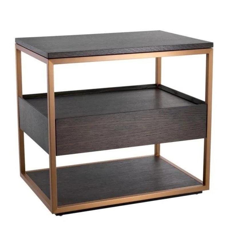 A csiszolt srgarz borts fmvz s a mokks tlgy furnrbl kszlt test egyedi kombincija teszi a Parker fa jjeliszekrnyt igazn klnlegess. Az jjeliszekrny egy fikkal rendelkezik, amelyet alulrl s fellrl is egy-egy polcrsz egszt ki a praktikusabb trolsi megolds rdek