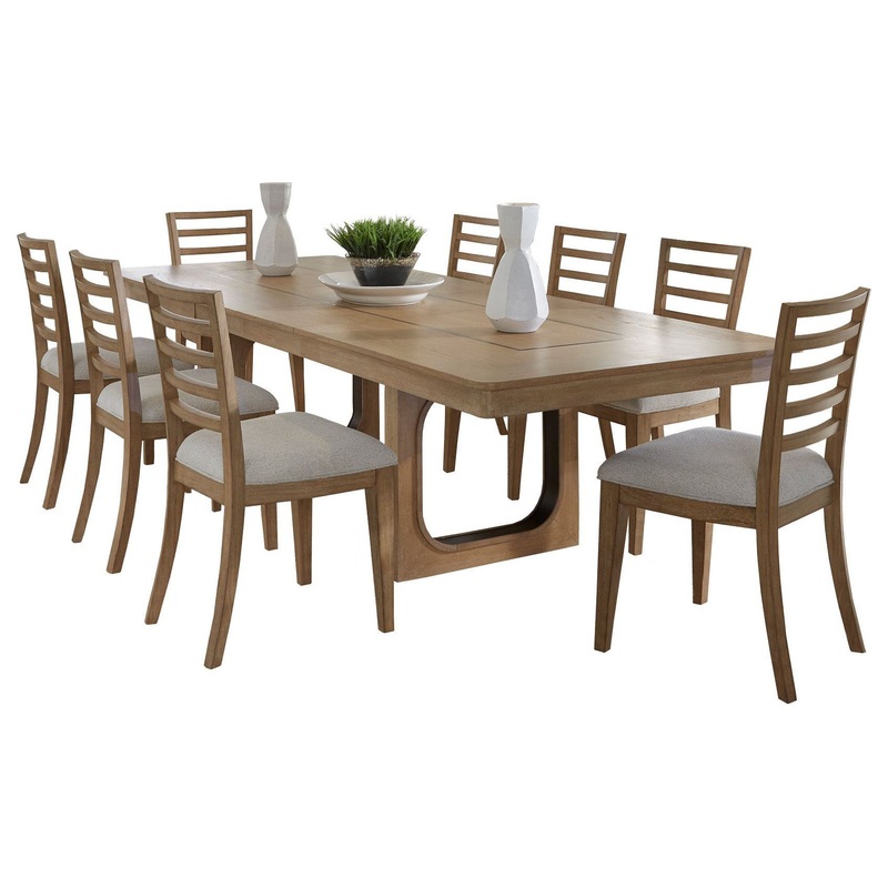 -Set includes grand 84″ rectangular table and eight coordinating ladderback chairs from the Escape Collection