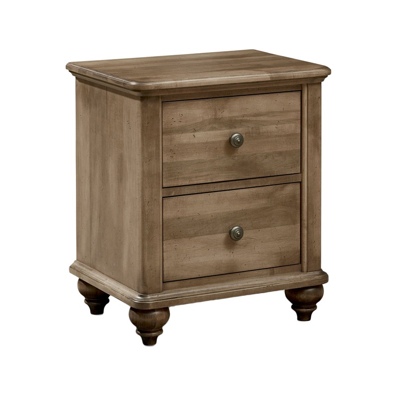 The Millcroft 2 Drawer Night Stand by Durham is a contemporary night stand made of solid maple wood with a lightly distressed finish. The night features two drawers with customizable hardware. Four solid wood knob legs make this night stand the perfect bed