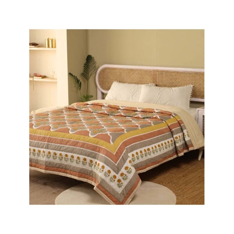 Experience timeless comfort with this set of 1 marigold collection queen quilt from Peepul Tree. Crafted from premium quality cotton with a fabric quality of 180 GSM, this quilt blends tradition and modern design. It features a soft, cozy feel with lightweight warmth, adding cultural richness and elegance to your space.
