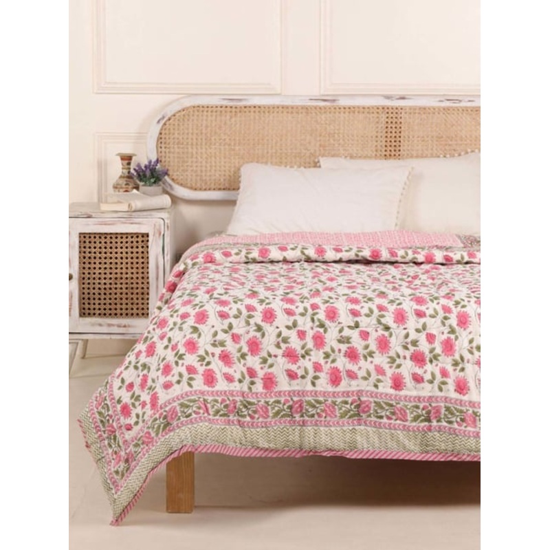 Add elegance to your bedroom with this hand-block printed Jaipuri Razai. Crafted from soft, breathable cotton, it offers year-round comfort and durability. Quilted with pure cotton filling, it helps regulate body temperature for restful sleep. The Sanganer