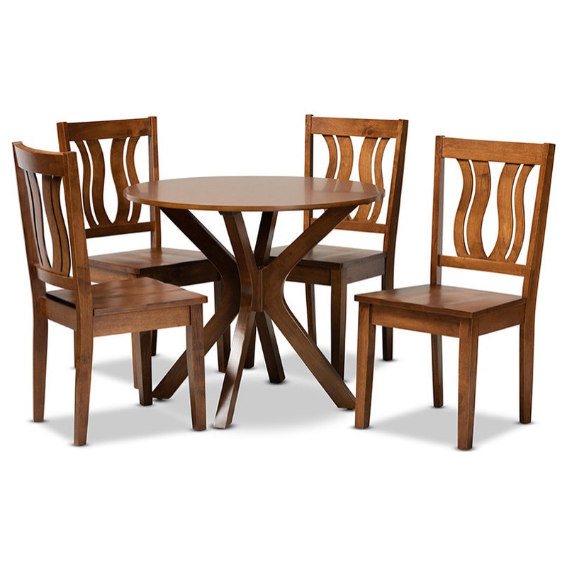 Featuring a unique, visually striking design, the Pelletier dining set adds elegance to any dining space. Made in Malaysia, the Pelletier set includes four chairs and one table showcasing a warm walnut brown finish. Each chair features a refined geometric cut out design on its backrest for added visual appeal, while a scoop seat lends casual comfort. Requiring assembly, the circular tabletop provides ample elbow room for each member of the table. Emanating graceful charm, the Pelletier dining set is an exceptional addition to the modern home.