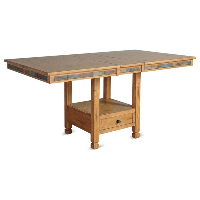 This dual height dining table is a classic statement of craftsmanship and features one 12" self-storing butterfly leaf. Built to perfection with a meticulous attention to detail, using distressed mindi solids and veneers. Features: -Materials: Wood -Finish
