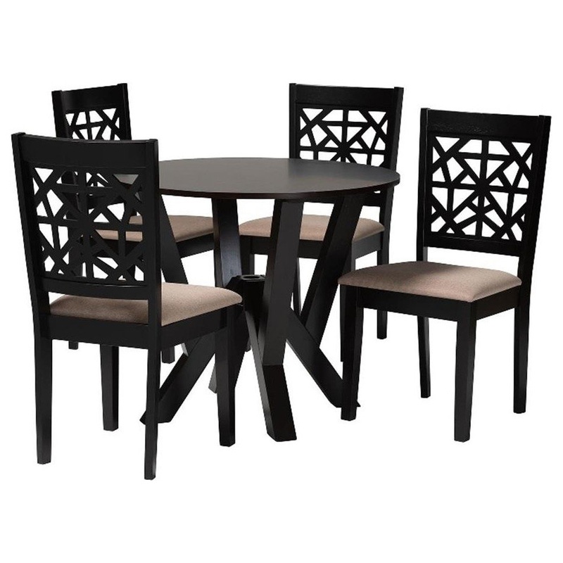 The crisp geometry and cozy design of the dining set elevates any occasion. Made in Malaysia, this modern set includes four chairs and one table crafted from sturdy wood. Each seat is padded with plush foam and upholstered in soft fabric while the backs of the chairs feature a unique cut-out design for a captivating display. The requires assembly and utilizes a round tabletop supported by an intersecting base for a chic, sculptural effect. Anchoring your arrangement with contemporary flair, the dining set is a remarkable arrangement.