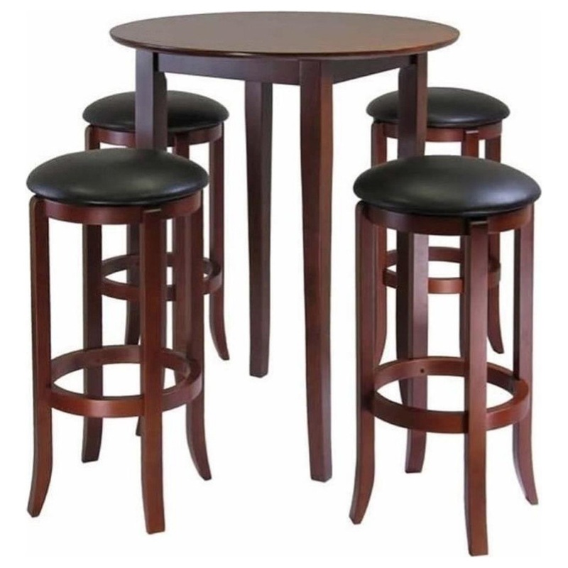 Refined details and casual elegance best describe this pub-style table with slightly flared legs. With a deep, rich walnut finish, the round table is an ideal size for a cozy dinner, working on your laptop or a game of cards. 5-Pc Table & Stools Set. Featu