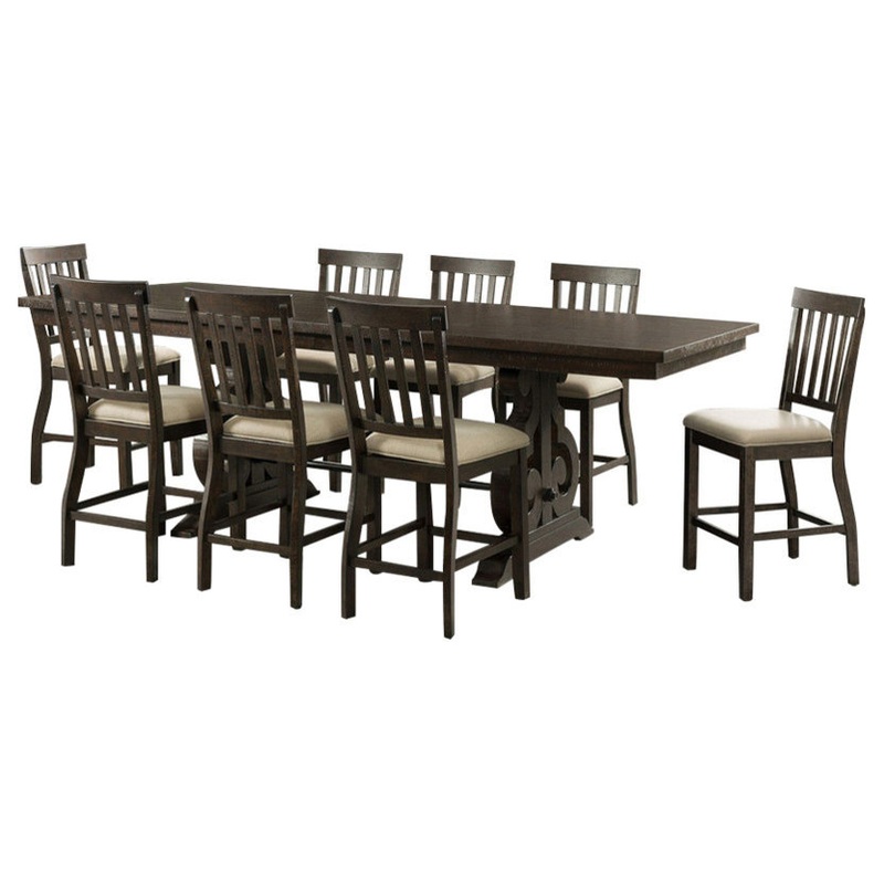 The Picket House Furnishings Counter Height Dining Set is the best thing you can do for your dining room! This set includes a counter height table and slat back counter height chairs. You’re in luck if you need extra space, or just have a really large dining room, because this table comes with two 18″ extension leaves. Another cool thing about the table is its intricate base, giving this table a major wow moment. The side chairs feature a slat back design with a taupe upholstered seat that matches beautifully with the smokey walnut finish.