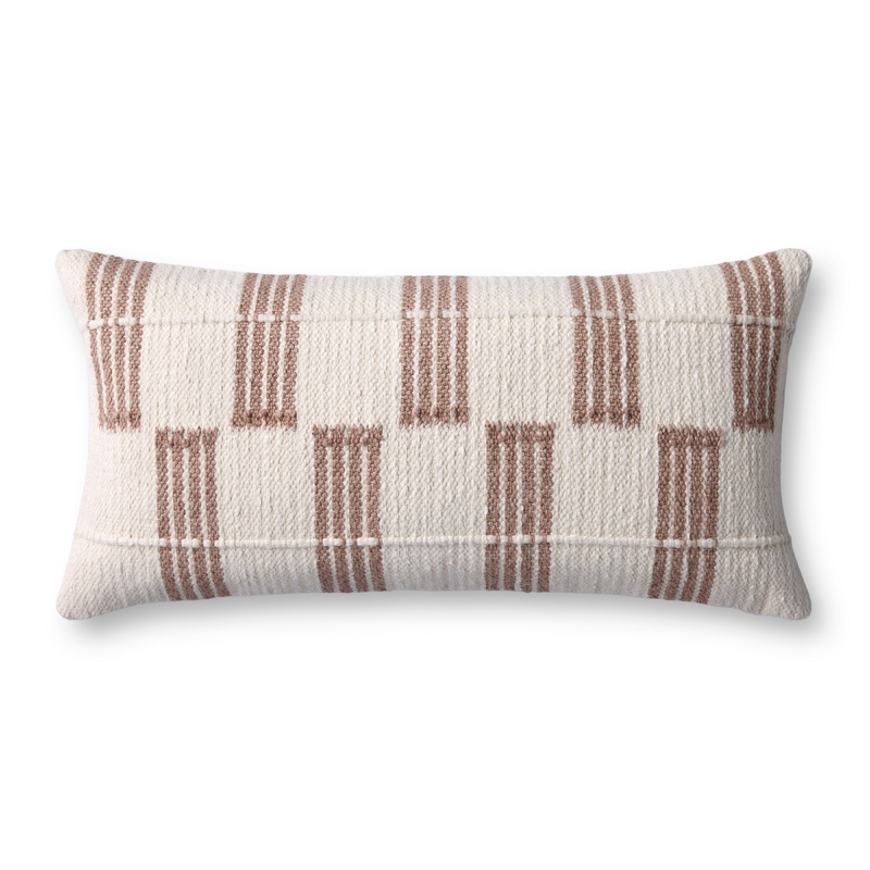 This woven throw pillow features a muted rust and ivory broken stripe pattern with raised stitched detailing. The pillow cover is made of cotton and polyester and measures 12 x 27, an elongated size to style in living rooms and bedrooms.