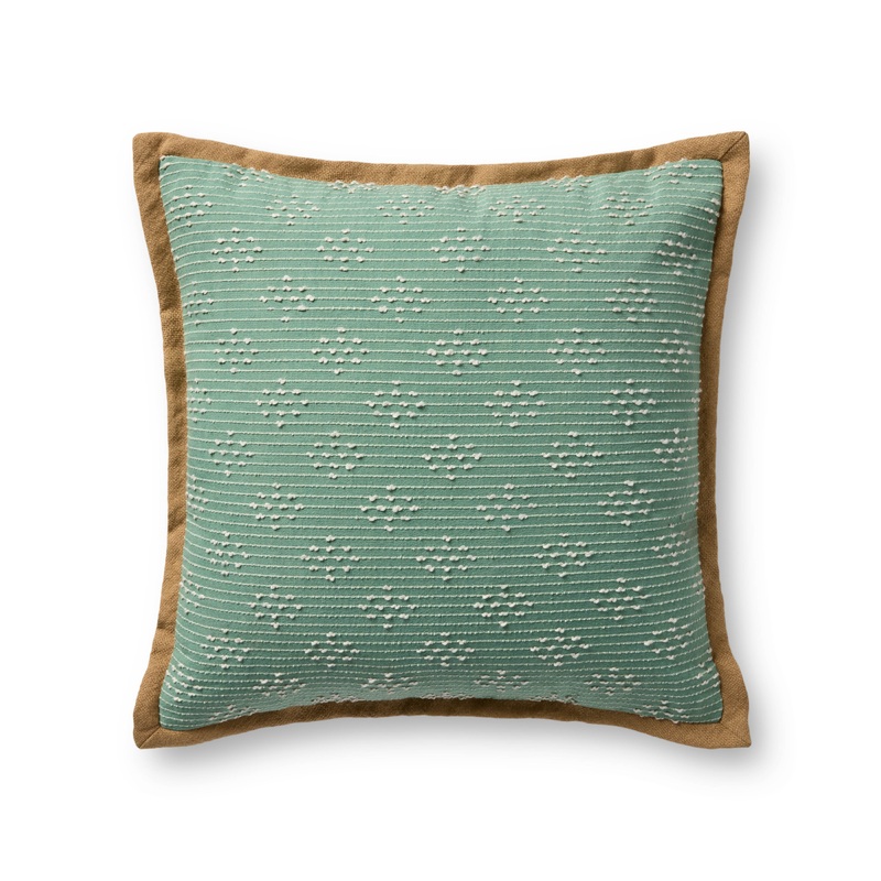 This vibrant throw pillow features a white geometric design and tan flange, adding a pop of color to your home decor. The 20 x 20 square pillow is power-loomed of polyester in India.