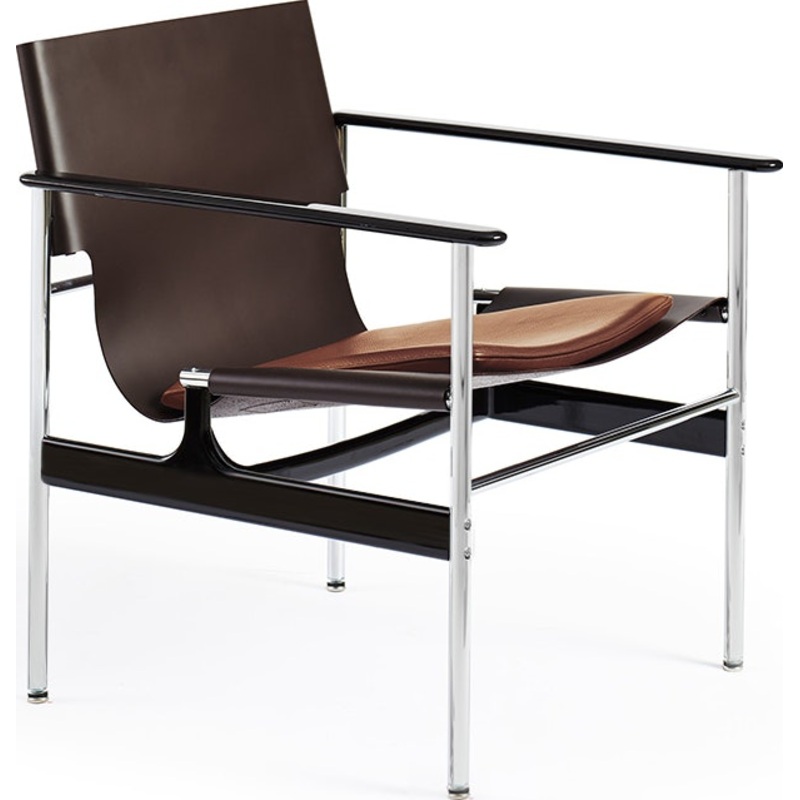 The steel and leather Pollock Armchair (1960) is a sleek sling-style chair thats marked by a refined combination of materials and finishes. It consists of a premium leather sling set atop a chromed tubular steel frame with cast-aluminum arms and stretchers