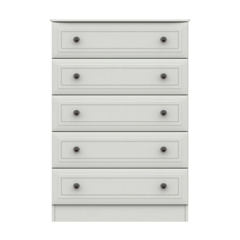 The Portia 5 Drawer Chest offers a stunning timeless design, perfect for enhancing any bedroom space. This stylish chest of drawers offers a traditional styling, with its elegant bevelled edge profile drawer fronts with beautiful crystal look handles. Supplied fully assembled for convenience, the Portia comes with three spacious drawers, complete with 8mm heavy duty bases, linen look insides and easy glide metal runners.