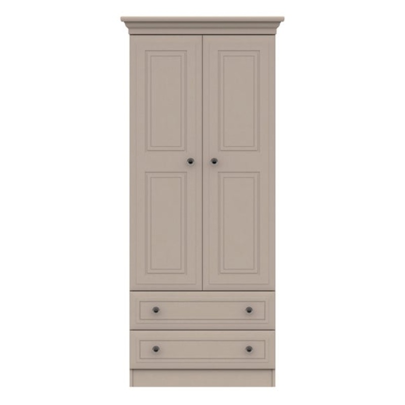 Finished in a choice of white and fired earth melamine finishes, the Portia 2 Door Combi Wardrobe offers a stunning timeless design, perfect for enhancing any bedroom space. This stylish wardrobe offers a traditional styling, with its elegant bevelled edge profile door fronts, decorative corniche and beautiful crystal look handles. Supplied fully assembled for convenience, the Portia comes with a spacious hanging area and two large drawers, complete with linen look insides, 8mm heavy duty drawer bases and easy glide metal runners.