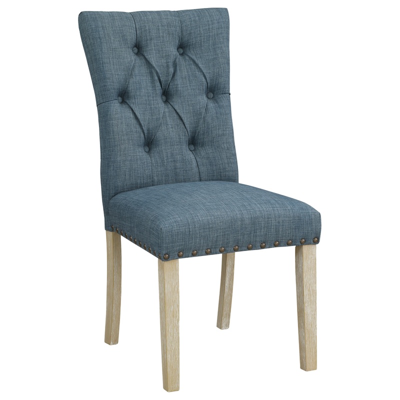 Preston Dining Chair with Antique Bronze Nailheads in Indigo Blue Fabric Set your table in Cottage, Farmhouse style with our 2-Pack button tufted dining chair. Charming nailhead trim and solid wood leg in a wash finish will create the coziest of nests. Gat