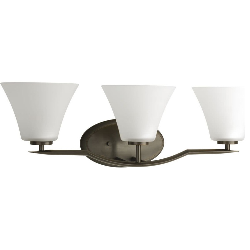 Three-light bath finished in Antique Bronze with etched glass shades scaled across a slightly arching, pointed arm. Generously balanced glass shades add distinction and provide pleasing illumination to your room. Coordinating fixtures from this collection let you decorate an entire home with confidence and style. Features: Antique Bronze finish Evenly scaled etched white glass Slightly arching arm gives a casual flair Coordinating fixtures from this collection Reversible Mounting – May be installed with the glass pointed upward or downwards Mounting strap for outlet box included Backplate covers a standard 4″ recessed outlet box Threaded socket ring secures glass Pre-wired 1 year limited warranty Steel construction 6″ of wire supplied Dimensions: Height: 8.75″ Width: 26.75″ (measured from furthest point left to furthest point right on fixture) Depth: 8.75″ Extension: 8.75″ (measured from mounting surface to furthest protruding point on fixture) Wire Length: 6″ Electrical Specifications: Bulb Base: Medium (E26) Bulb Included: No Number of Bulbs: 3 Watts Per Bulb: 100 Wattage: 300 Voltage: 120v