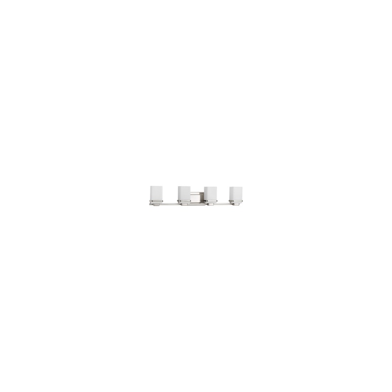 Enjoy a cool and sleek modern design with the four-light bath & vanity in the Metric Collection. A simple, etched opal glass shade nestles inside a die-cast frame that is finished in Brushed Nickel providing light above and below the fixture.