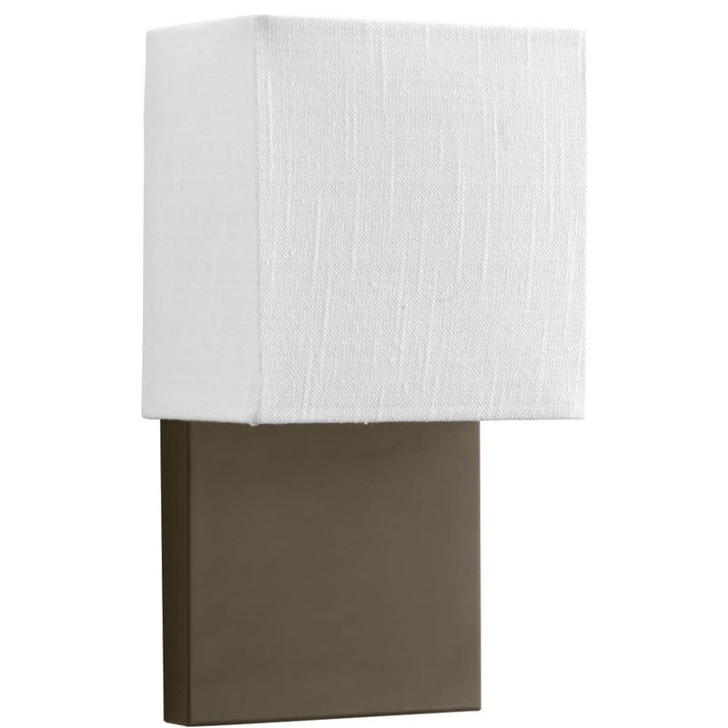 An elegant white linen shade that is open on the top and bottom diffuses light efficiently. Ideal for vanity and hospitality applications. Features Includes mounting strap for outlet box Backplate covers a standard 4" outlet box Flicker free dimming to 10%