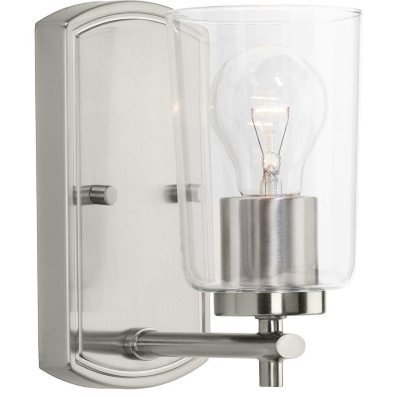 Create a haven for relaxation and revival with the Adley one-light bath. This fixture features a Brushed Nickel, curved backplate attached to a simple, clear glass shade. The modern piece is perfect for adding ambient light to bathroom and vanity settings in traditional and transitional interiors.Perfect for adding ambient lighting to bathroom and vanity settings;Backplate has a graceful beveled detailing and is attached to a simple bar holding the glass-shaded light;Finished in a subtly reflective Brushed Nickel for an elegant matte texture;Mount on a wall on either side of a mirror to eliminate shadows on the face when getting ready for the day or for a night out;A sophisticated choice for new traditional and transitional settings;Can be displayed individually or in groups of two or more;Can be mounted facing up or down;Measure 4-1/2 in width X 7-3/4 in height;Uses one 60-watt max medium base bulb, or the LED equivalent, that is sold separately;Includes installation instructions and mounting hardware;Progress Lighting products are designed for exceptional quality, reliability, and functionality Room Style: Bathroom 1 year Warranty Mounting Direction: Up or Down Shade Included: YesAdley One Light Bath Vanity Brushed Nickel Clear Glass *UL Approved: YES *Energy Star Qualified: n/a *ADA Certified: n/a *Number of Lights: Lamp: 1-*Wattage:60w Medium Base bulb(s) *Bulb Included:No *Bulb Type:Medium Base *Finish Type:Brushed Nickel
