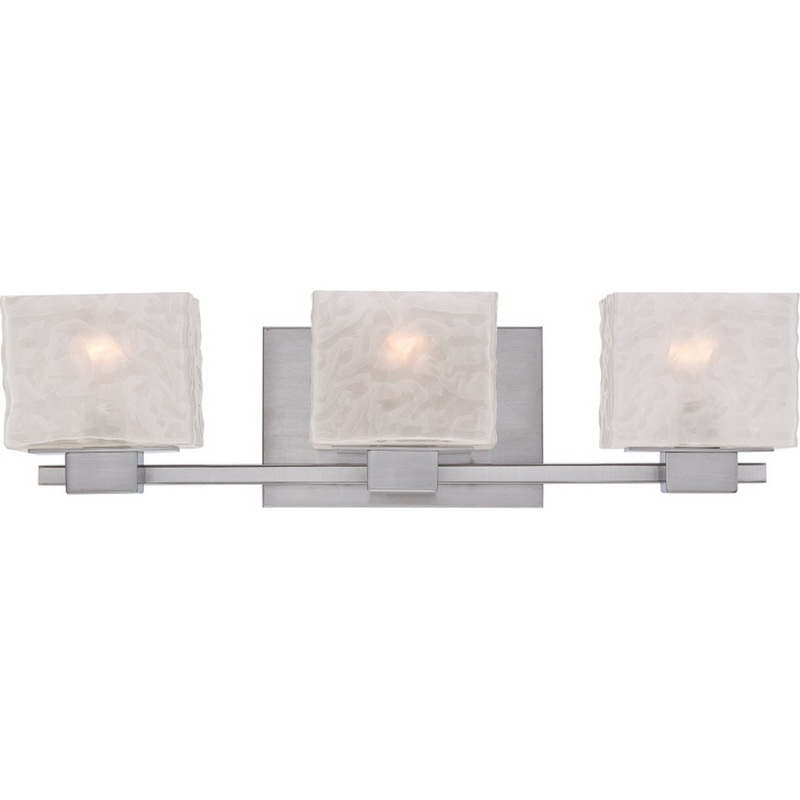 Three Light Bath from Melody collection in Brushed Nickel finish. Number of Bulbs 3. Max Wattage 100.00 . No bulbs included. A perfect blend of fashionable style the Melody bath collection is the trend with its hints of edginess. It consists of sleek sand blasted glass and is complimented by the Brushed Nickel finish. No UL Availability at this time.