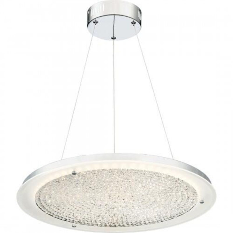 A simple yet stunning pendant, the Blaze series is modern and sleek. The shimmering crystals float on a disk on glass that is frosted on the perimeter to enhance the striking design. The Polished Chrome finish on the base and accents add the perfect finish