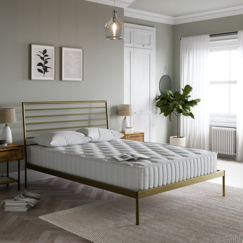 Crafted from durable metal, this bed frame features a contemporary design with clean lines and a painted finish that adds a touch of sophistication to your space. The frame is equipped with sprung slats, which provide enhanced comfort and support by adapting to your body’s movements, ensuring a restful night’s sleep.