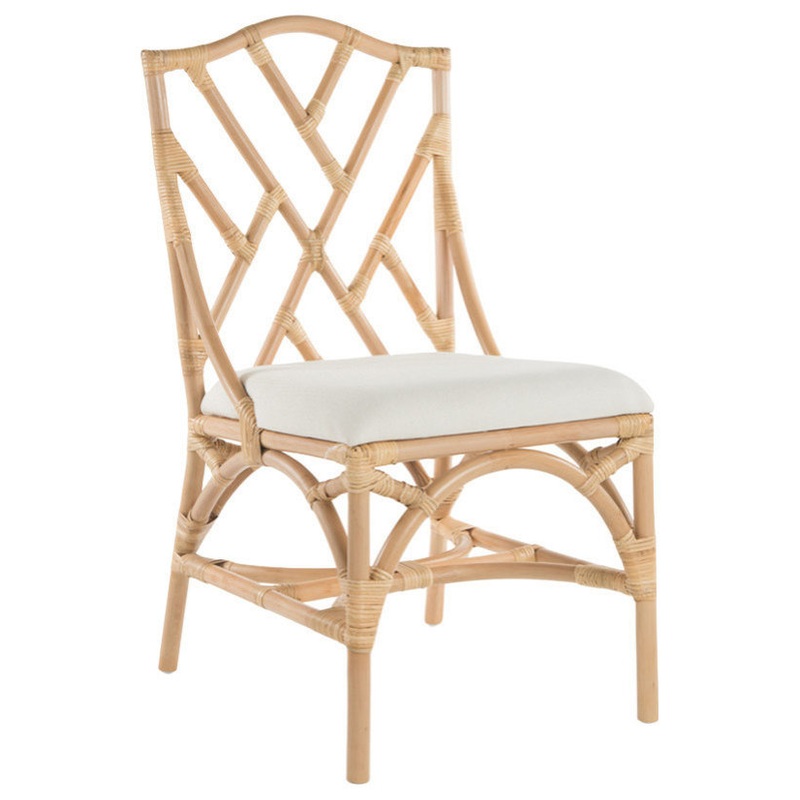 -Offered as a set of 2 chairs without armThe Rattan Chippendale Upholstered Dining chair in natural makes an ideal addition to any coastal style home. The tropical style of the rattan frame lends itself to a dining room, living room or other living space in your home.