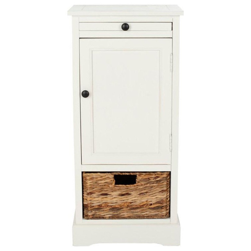 Relaxed and casual, the Raven storage unit in pine with distressed cream finish has an easygoing appeal that's perfect for a country casual style. With a roomy cabinet and one pull out woven basket, Raven makes stashing remotes, CDs and magazines a breeze.