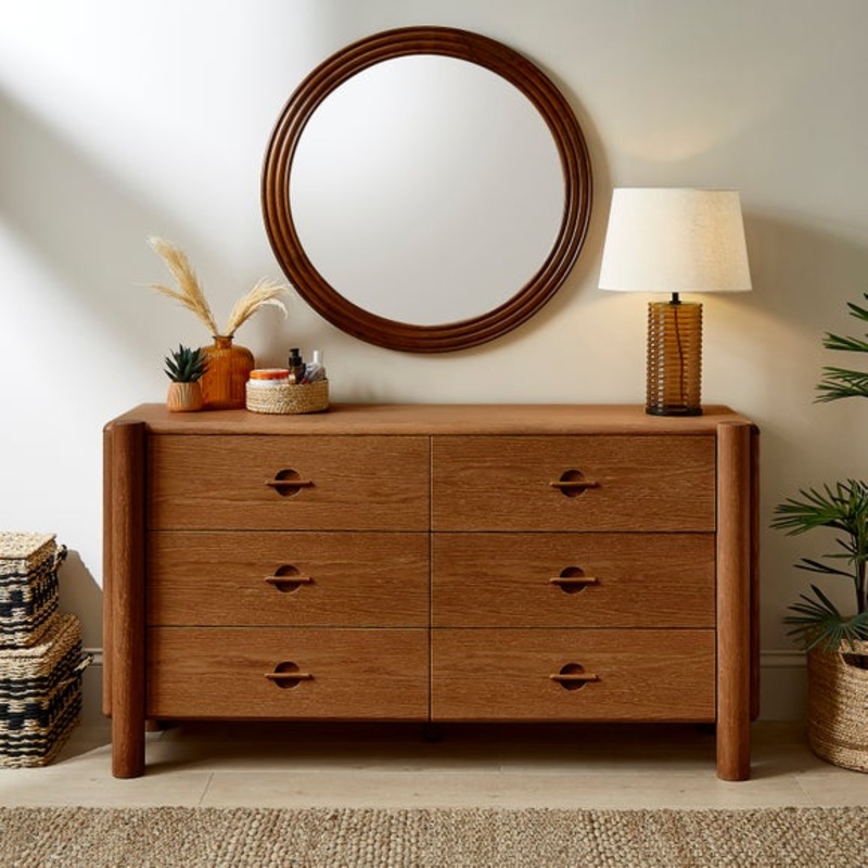Art deco styleWooden frameGroove handlesCurved top and legsThe Reeva chest of drawers is a beautifully crafted piece that brings elegance and practicality to your bedroom. With its gently curved top and legs, this chest has a soft, organic silhouette that