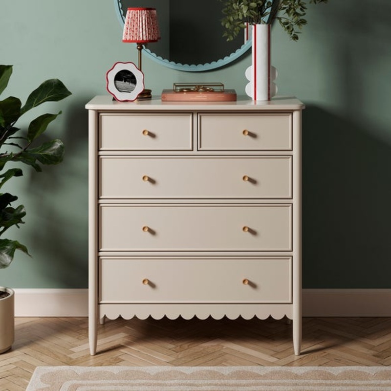 Organise your essentials with ease, from clothing and linens to accessories and personal items, keeping your space tidy and clutter-free. Equipped with five soft-close drawers, this chest offers ample storage for your belongings. The soft-close mechanism ensures quiet and effortless operation, preventing any jarring noises or accidental slams. With its rounded edges and scallop apron, this chest of drawers adds a graceful flair to any room. The gentle curves create a sense of harmony and balance, while the soft grey colour brings a contemporary touch to your space, creating a serene and calming experience. The generously sized table top provides an excellent display area for showcasing your favourite ornaments, cherished photographs, or a bouquet of vibrant flowers. The sturdy construction guarantees long-lasting use, making it a reliable companion for years to come.