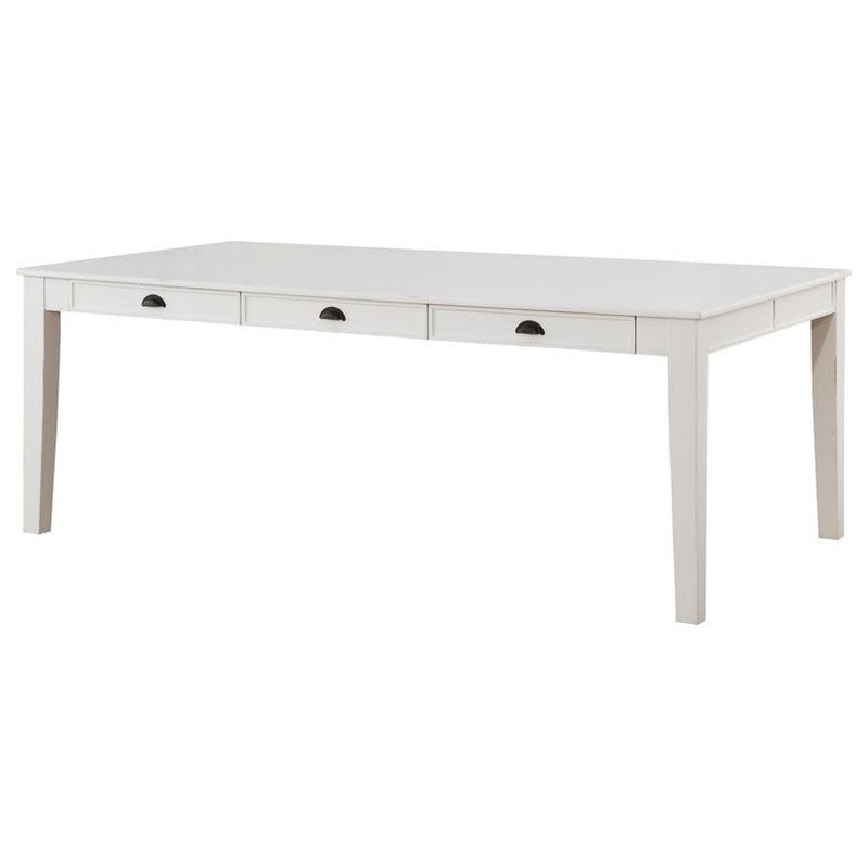 Friends and family will enjoy gathering around the charming farmhouse style dining table. Finished in a antique white and black finish. The sturdy solid top, sleek tapered legs, and six storage drawers with cup pulls, on both sides of the table, are perfect for storing napkins, extra placement or other dining essentials.