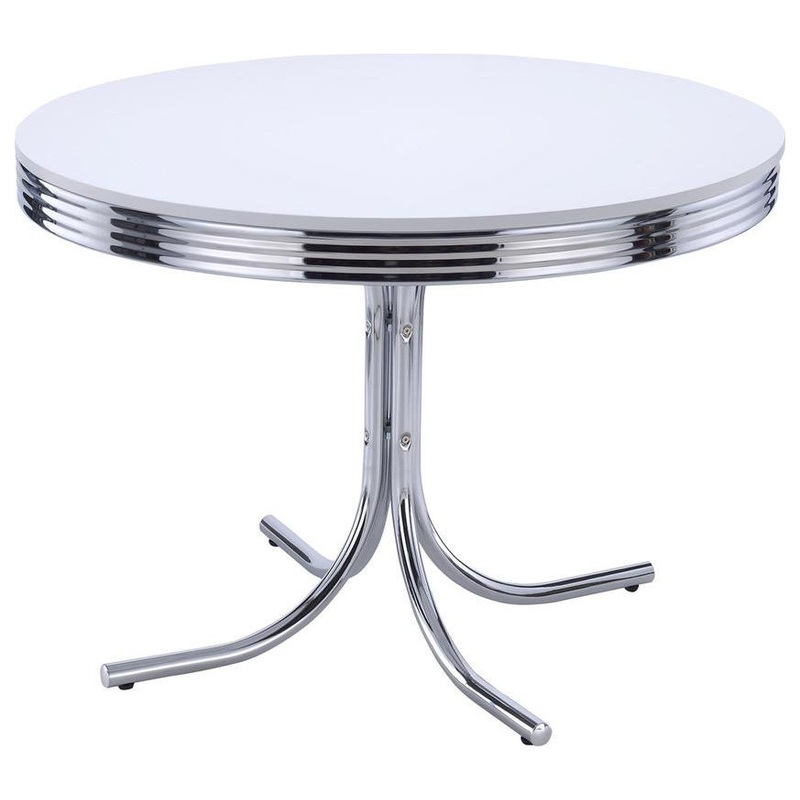 Travel back in time to an easy era where soda shoppes served as social centers. This five-piece dining set features a classic round dining table with a metal ellipse edge profile and shiny top. A decadent flared metal base is open and airy, matching the de