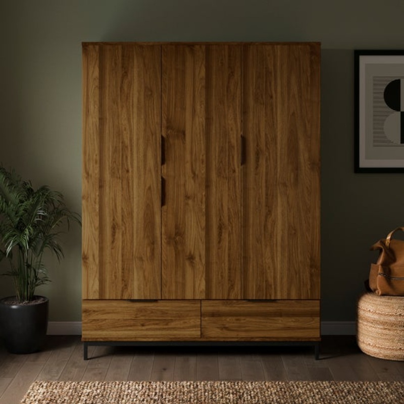 Wooden finishHeight adjustable shelvesEasy to assembleWith its wooden effect finish, this wardrobe brings a touch of countryside charm to your bedroom decor. Crafted with ample storage in mind, it features three doors that open to reveal a generous hanging