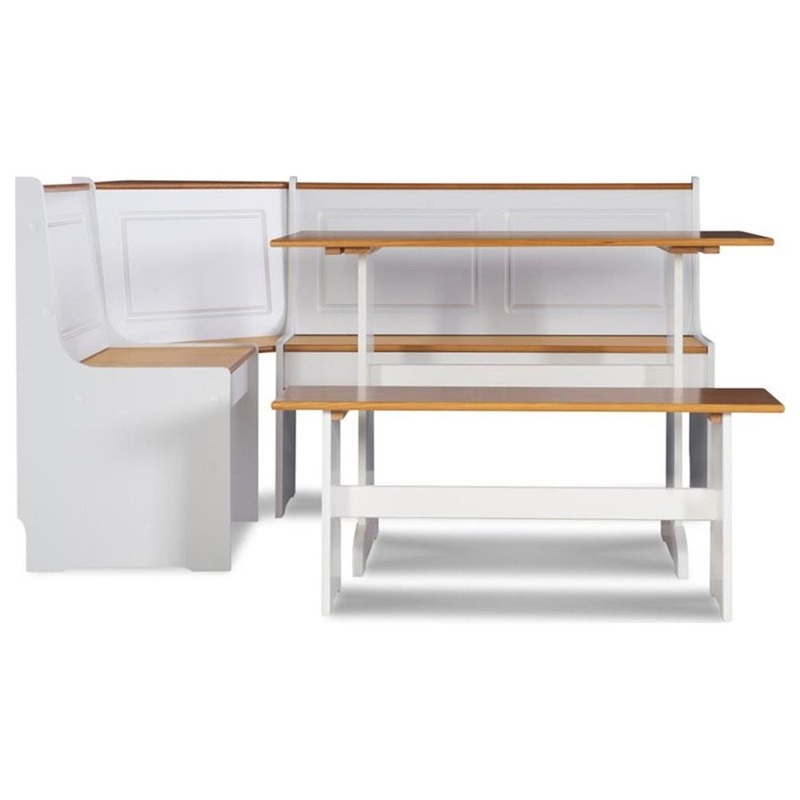 Elevate your kitchen with the Riverbay Furniture Wood Indoor 3 Piece Kitchen Corner Nook Dining Set in White. This kitchen corner nook set becomes a focal point of comfort and style. The white finish brightens up your space, while the corner configuration