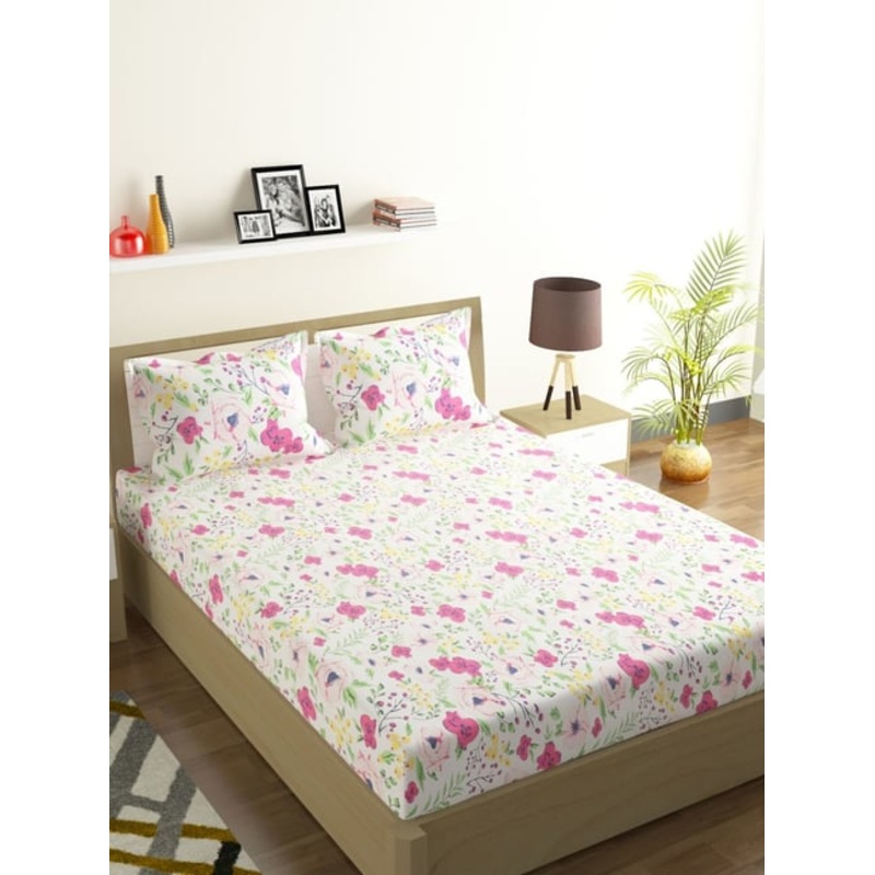 Romee Floral White & Pink 144 TC Cotton Queen Sized Bed Sheet with 2 Pillow Covers