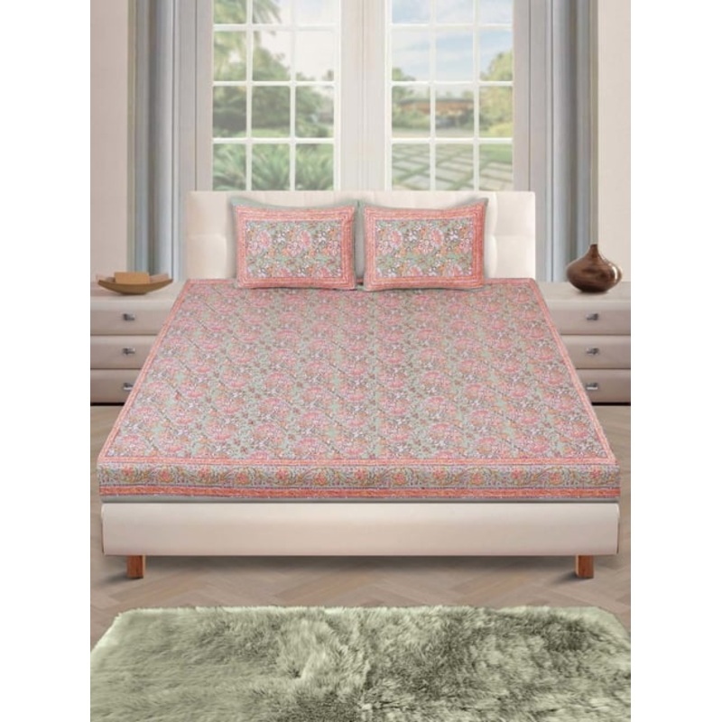 Enhance the beauty of your bedroom interiors with this king-sized bed sheet set from the house of Romee. It is durably crafted with cotton with a thread count of 180. This set comes with a floral pattern which soothes your eyes and the soft touch will help you in getting a pleasant sleep. It gives a graceful and modern look to any bedroom. It retains its vibrant color, providing the needed charm to complete any bedroom which lasts a lifetime. It comes in a set of 1 bed sheet and 2 pillow covers.