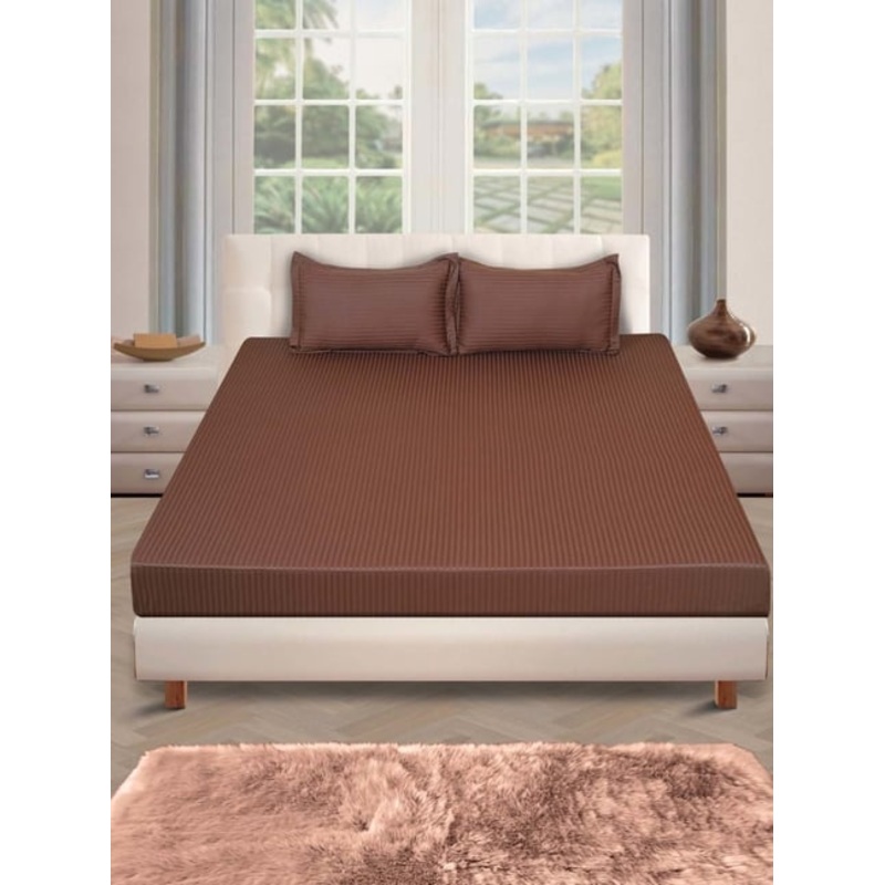 Enhance the beauty of your bedroom interiors with this king-sized bed sheet set from the house of Romee. It is durably crafted with cotton with a thread count of 250. This set comes with a striped pattern which soothes your eyes and the soft touch will help you in getting a pleasant sleep. It gives a graceful and modern look to any bedroom. It retains its vibrant color, providing the needed charm to complete any bedroom which lasts a lifetime. It comes in a set of 1 bed sheet and 2 pillow covers.