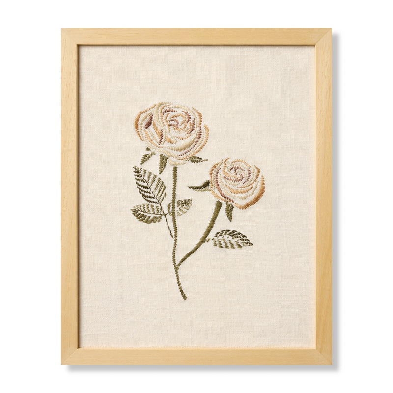 Rose Bud wall art features delicately minimal embroidered rosebuds, a beautiful accent piece for many home decor styles, from farmhouse to traditional. The artwork is made in India of cotton and custom framed by Loloi in the USA, measuring 15 x 12.