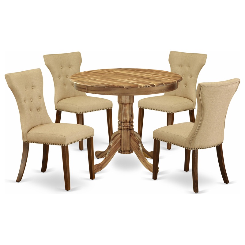 East West Furniture 5-Pc table and chairs dining set including 4 parsons dining room chairs and a round luxurious modern dining table will increase the elegance of your dining room or kitchen areas. Our dining table set is manufactured from solid Asian woo