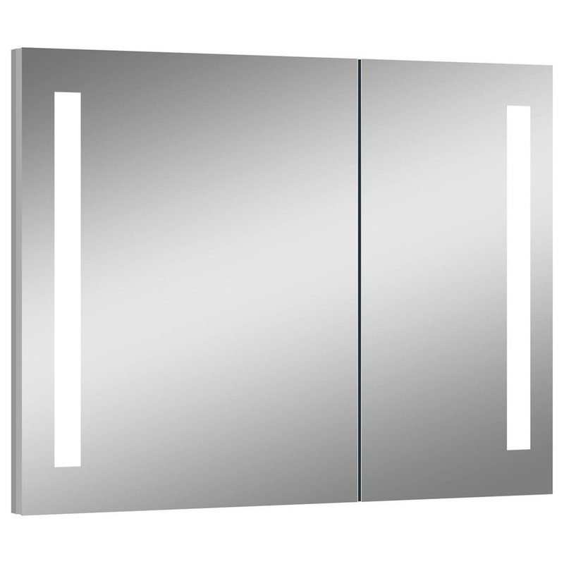 A recessed two door cabinet designed in extruder aluminum combines the look of a LED light source and the need for storage in a mirror. The Royale comes with two glass shelves and an electrical outlet inside the cabinet along with a mirror on the inside for the close up needs.