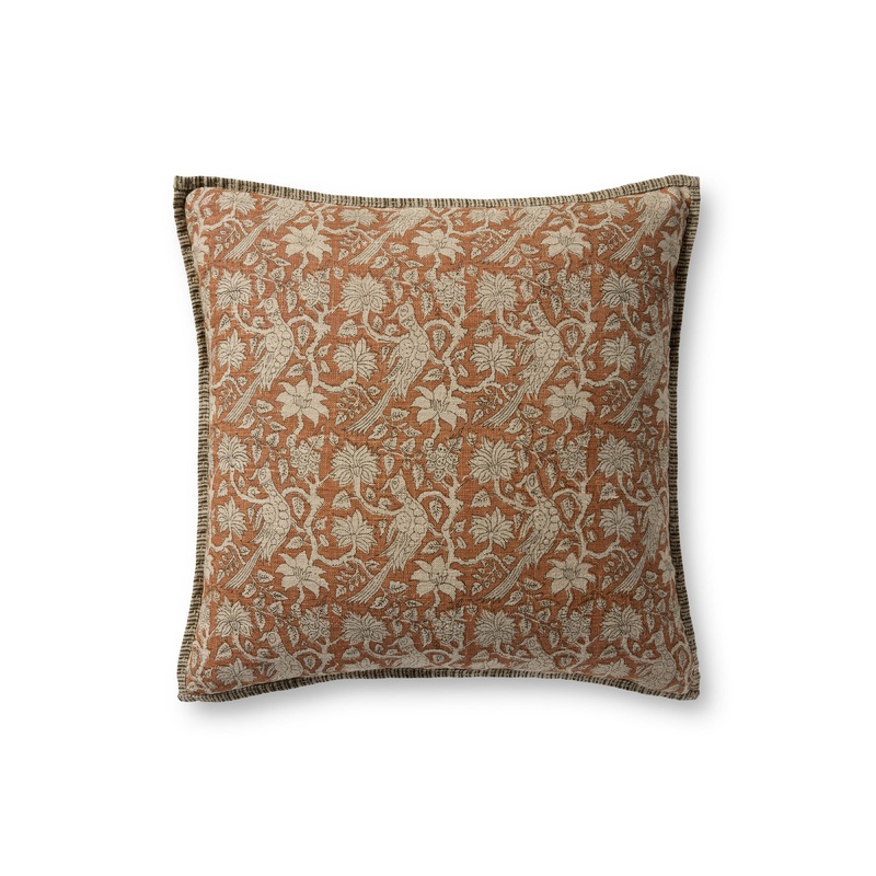 This beautiful floral linen throw pillow has a muted clay and beige palette with stitched edge details for traditional, farmhouse, or coastal home decor, among many classic styles. The 22 x 22 square throw pillow can be an elegant accent on a bed, couch, or chair. The pillow cover is woven of 100% linen in India.