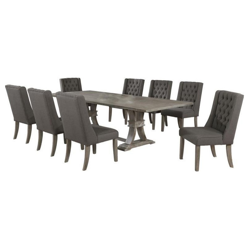 Complete 9 piece dining set with an extendable table and 8 chairs. The table comes with 2 removable leaves that can extend the table by 32" and is made of rustic brown gray wood. The chairs are upholstered and tufted with gray linen and their wood frame pe