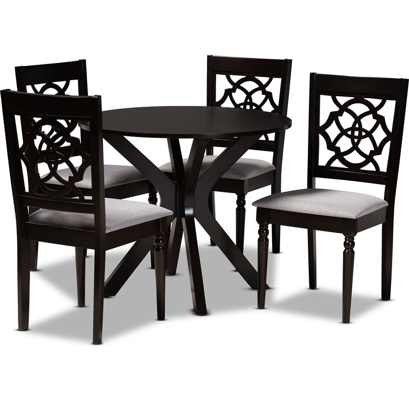Contemporary style meets modern comfort with the Sadie dining set. Made in Malaysia, the Sadie includes four chairs and one table constructed from sturdy wood finished in a rich dark brown. Each chair features a unique cut-out design on its back and is fitted with a foam-padded cushion upholstered in smooth grey fabric. Requiring assembly, the circular tabletop allows ample elbow room for each member of the table. Perfect for both casual and formal occasions, the Sadie dining set easily elevates any dining experience.