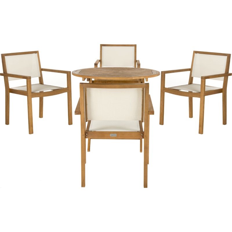 For endless fun in the sun look no further than this classic 5-piece dining set. A modern investment, its 34.5 round dining table and four ample chairs are crafted in a natural hue and feature timeless white upholstery. Designers love its versatility and value.