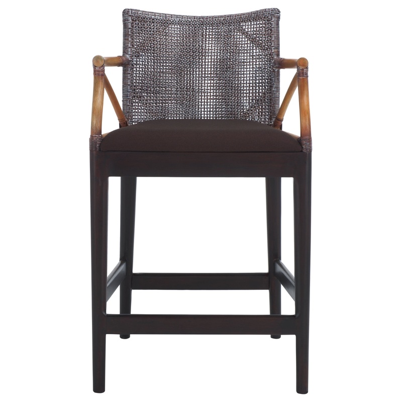 This chic counter stool features a charming blend of rich brown and white wash rattan and deep brown wooden legs, delivering a fusion of modern sophistication and natural charm. Constructed with wood and rattan, this stool embodies strength and durability, ensuring it can stand up to the demands of everyday use. The seat is generously padded for absolute comfort and is adorned with an exquisitely soft fabric.