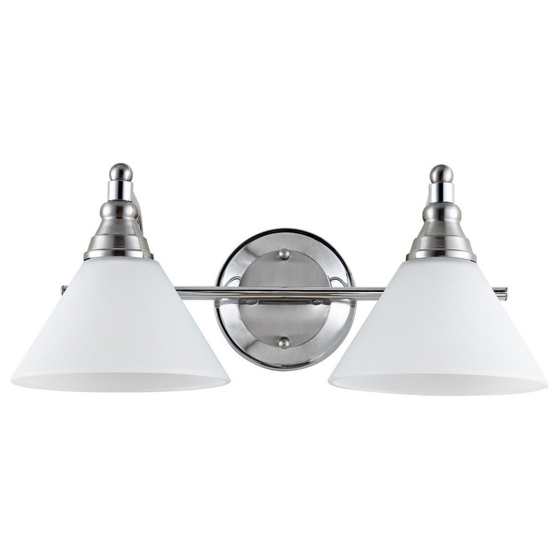 Design your own modern refuge with this contemporary Radnor Two Light Wall Sconce. A new spin on classic bathroom lighting, its polished nickel finish blend seamlessly with any style. Radnor's sleek white glass shades create a gentle, warm glow. -Lamp Cert