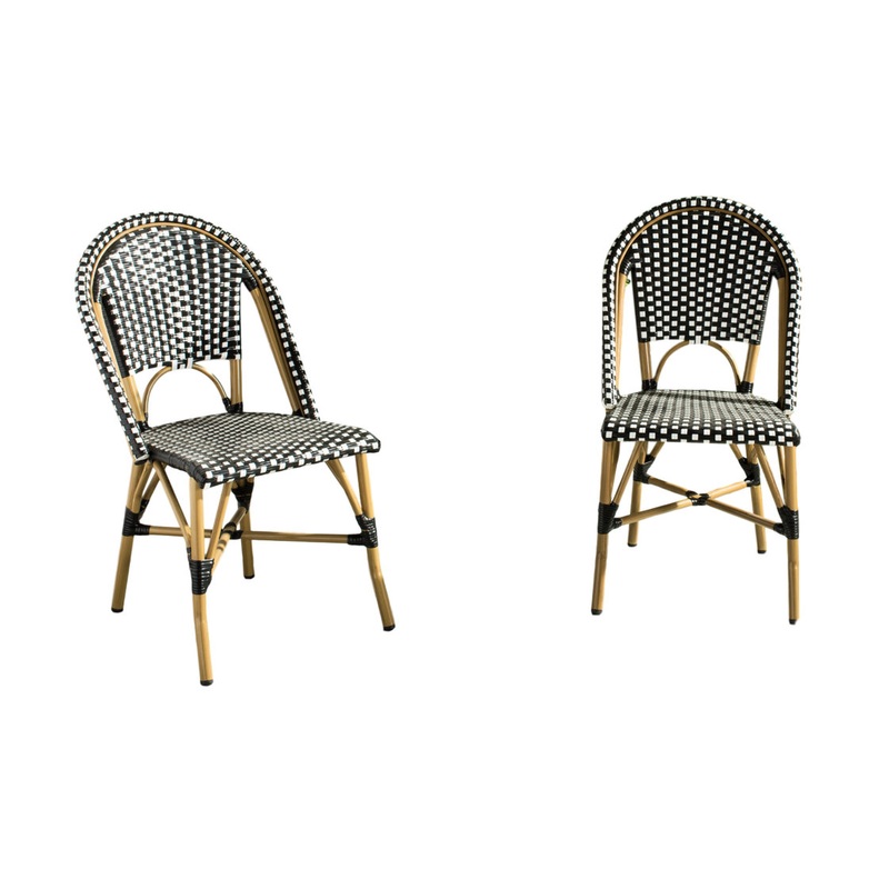 Whether your style is country or coastal, the Salcha indoor-outdoor stacking side chair from Safavieh is a colorful solution to extra guest seating. Inspired by classic European bistro chairs, the pretty and practical Salcha is crafted of blue and white PE wicker and aluminum faux bamboo for easy care.